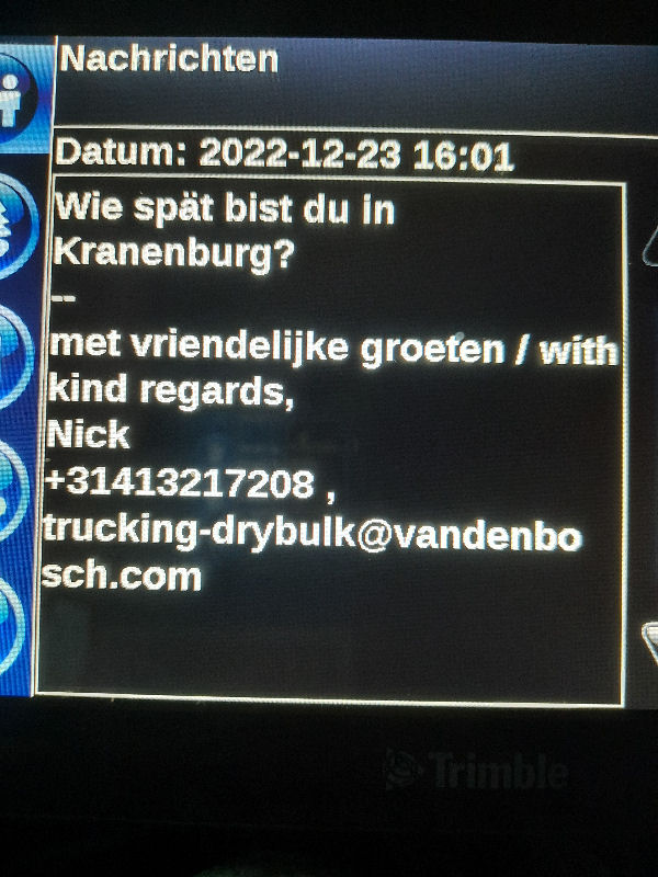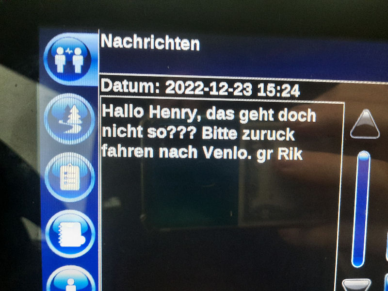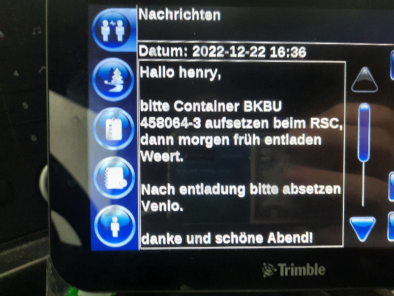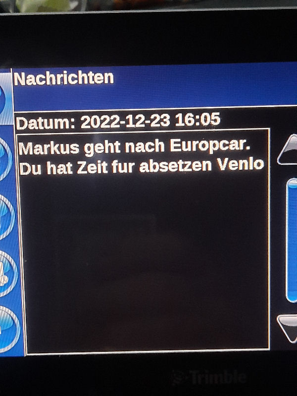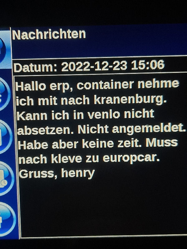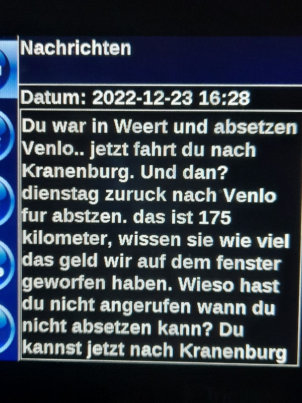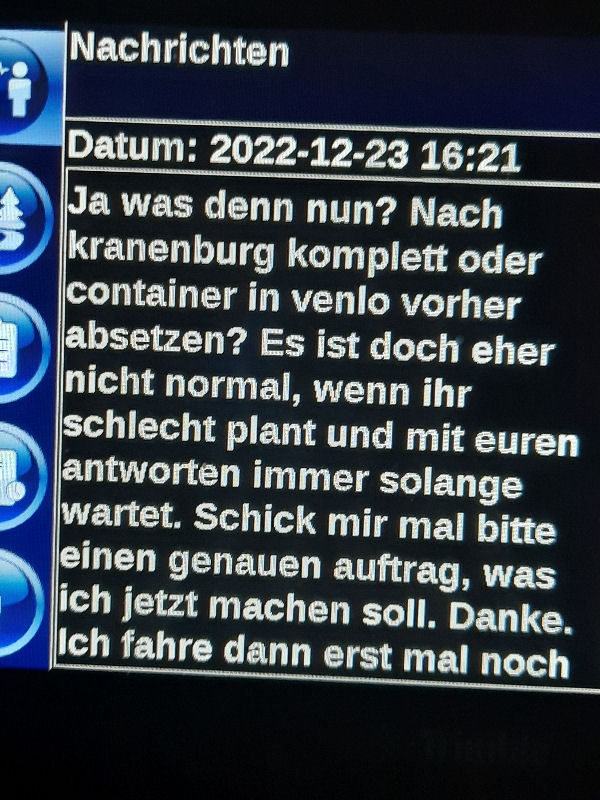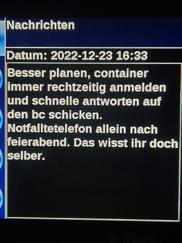 23. Dezember 2022 ![]() Fahrer: Henry Bleckert Truck 218 / Kennzeichen: 17-BFZ-1 Chassis 450 + Container BKBU458064-3 --- Arbeitsbeginn: 06:00 Uhr Truckparking Maasvlakte Durchgeführte Tätigkeiten: - Abfahrtskontrolle ---> - RSC Rotterdam Container aufsetzen + Zoll ---> - Einwiegen (LIMAGRAIN Weert) ---> - Anmelden, Entladen (NUKAMEL Weert) ---> - Auswiegen (LIMAGRAIN Weert) ---> - Abmelden (NUKAMEL Weert) ---> Geplant: Claessen Tankcleaning Venlo, Container im Depot absetzen --- Information durch Personalabteilung per WhatsApp um 12:24 Uhr: xxxxxxxxxxxxxxxxxxxxxxxxxxxxxxxxxxxxxxxxxxx "Hallo zusammen, Am Samstag d 24.12.2022 fahren Henry Bleckert und Gerhard Bosse mit dem PKW von Europcar nach Hause, Das Auto bitte selbstständig am 23.12.2022 um 16:45 Uhr bei Europcar Kleve, Tichelstraße 14 abholen. Europcar Kleve schließt um 17:00 Uhr. Bitte den PKW am 24.12.2022 bis 16:45 Uhr vollgetankt bei Europcar Berlin Alexanderplatz 8, 10178 Berlin abgeben. ![]() xxxxxxxxxxxxxxxxxxxxxxxxxxxxxxxxxxxxxxxxxxx Gegen 15 Uhr Claessen Tankcleaning in Venlo: Container ist nicht gemeldet, kein Absetzen möglich. Meldung an Planung per Bordcomputer um 15:06 Uhr. Tatsächlich geleistete Arbeitszeit zu diesem Zeitpunkt: 9h 6min. Keine Pause. --- Schriftwechsel per Bordcomputer am 23. Dezember: ![]() ![]() ![]() ![]() ![]() ![]() ![]() ![]() ![]() ![]() ![]() ![]() ![]() ![]() ![]() ![]() ![]() ![]() ![]() Pause an diesem Tag: Wegen schlechter Planung keine ... |