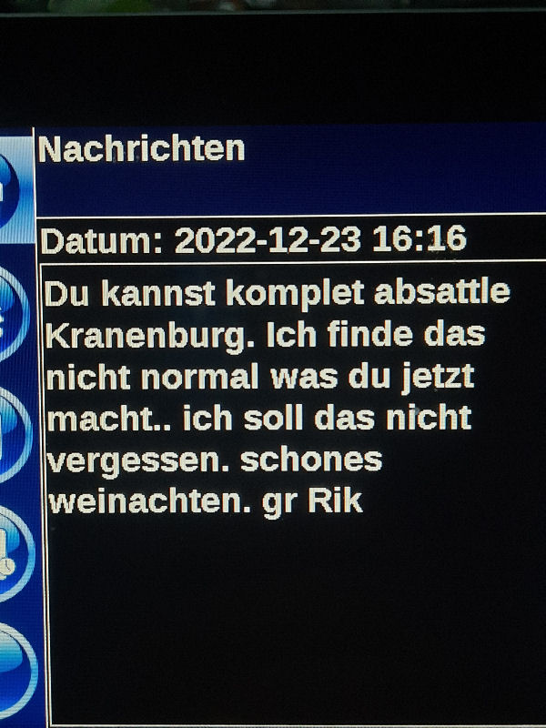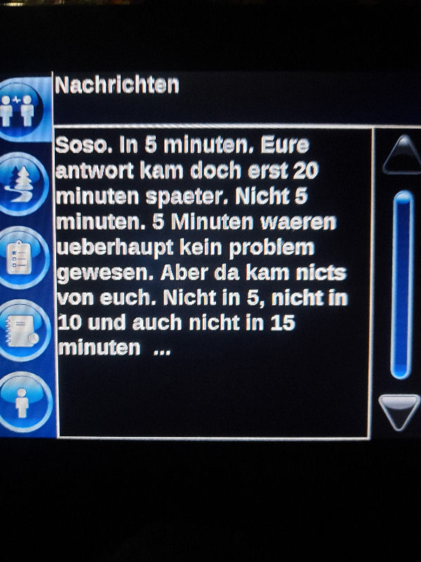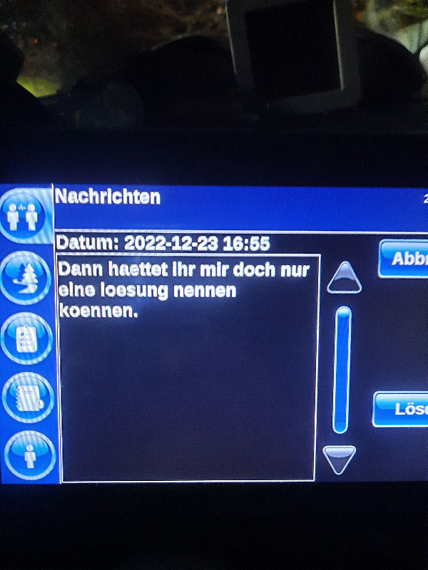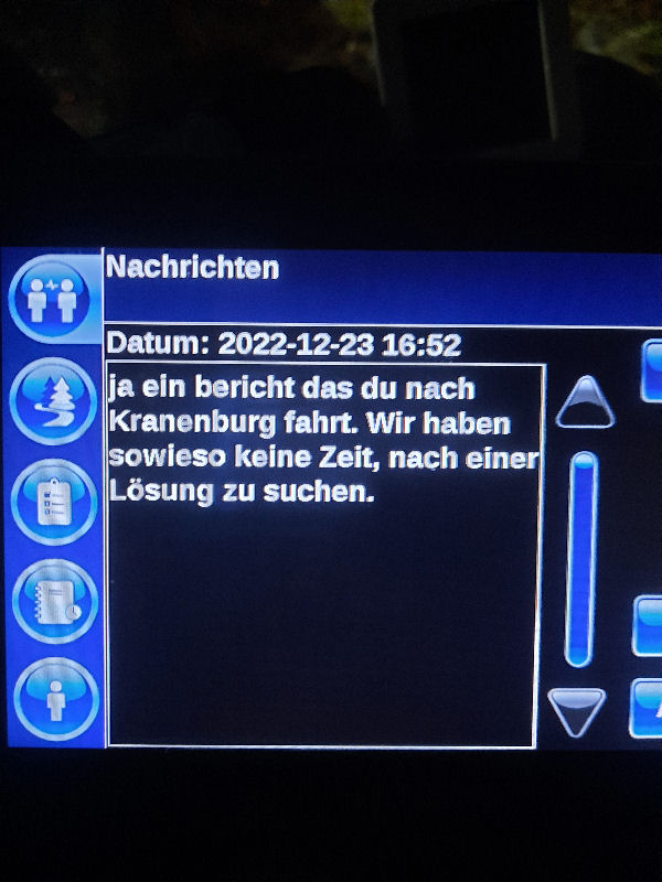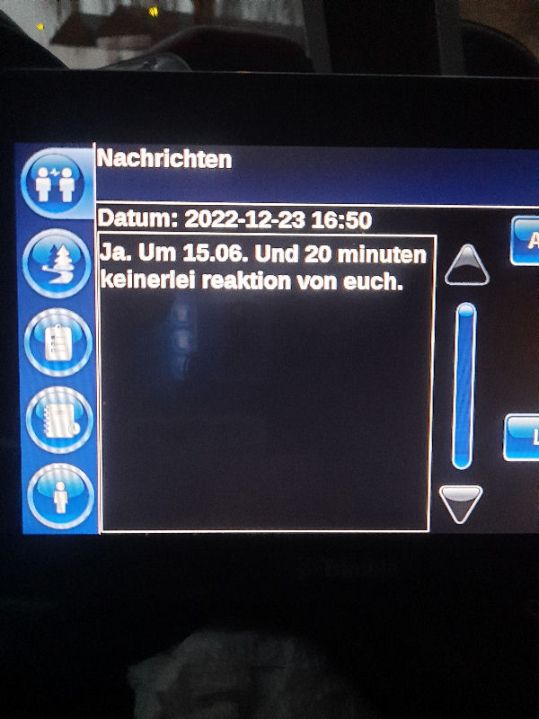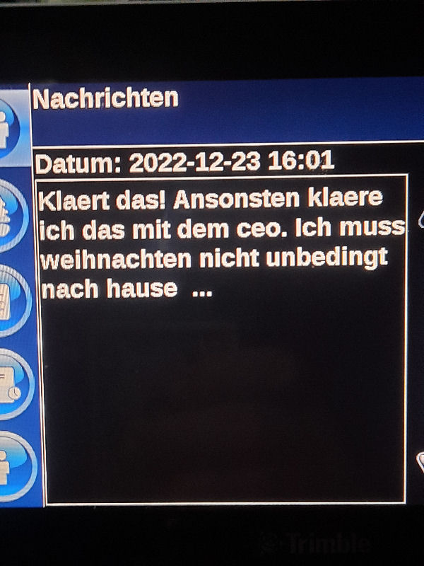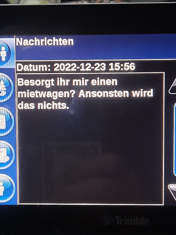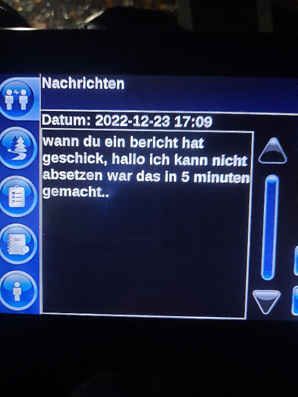 23. Dezember 2022 ![]() Fahrer: Henry Bleckert Truck 218 / Kennzeichen: 17-BFZ-1 Chassis 450 + Container BKBU458064-3 --- Arbeitsbeginn: 06:00 Uhr Truckparking Maasvlakte Durchgeführte Tätigkeiten: - Abfahrtskontrolle ---> - RSC Rotterdam Container aufsetzen + Zoll ---> - Einwiegen (LIMAGRAIN Weert) ---> - Anmelden, Entladen (NUKAMEL Weert) ---> - Auswiegen (LIMAGRAIN Weert) ---> - Abmelden (NUKAMEL Weert) ---> Geplant: Claessen Tankcleaning Venlo, Container im Depot absetzen --- Information durch Personalabteilung per WhatsApp um 12:24 Uhr: xxxxxxxxxxxxxxxxxxxxxxxxxxxxxxxxxxxxxxxxxxx "Hallo zusammen, Am Samstag d 24.12.2022 fahren Henry Bleckert und Gerhard Bosse mit dem PKW von Europcar nach Hause, Das Auto bitte selbstständig am 23.12.2022 um 16:45 Uhr bei Europcar Kleve, Tichelstraße 14 abholen. Europcar Kleve schließt um 17:00 Uhr. Bitte den PKW am 24.12.2022 bis 16:45 Uhr vollgetankt bei Europcar Berlin Alexanderplatz 8, 10178 Berlin abgeben. ![]() xxxxxxxxxxxxxxxxxxxxxxxxxxxxxxxxxxxxxxxxxxx Gegen 15 Uhr Claessen Tankcleaning in Venlo: Container ist nicht gemeldet, kein Absetzen möglich. Meldung an Planung per Bordcomputer um 15:06 Uhr. Tatsächlich geleistete Arbeitszeit zu diesem Zeitpunkt: 9h 6min. Keine Pause. --- Schriftwechsel per Bordcomputer am 23. Dezember: ![]() ![]() ![]() ![]() ![]() ![]() ![]() ![]() ![]() ![]() ![]() ![]() ![]() ![]() ![]() ![]() ![]() ![]() ![]() Pause an diesem Tag: Wegen schlechter Planung keine ... |